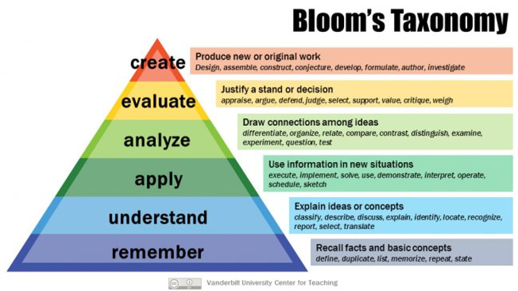 Usually, I’m more of a Fink’s Taxonomy of Significant Learning kind of guy as it is a much more holistic system. But, admittedly, I think Bloom is “easier” to implement, especially at scale. It also requires that you be in the right place mentally, if not “spiritually” to do it well. And this semester I have 72 students, double the number I’m used to in a totally new context. So, I’m playing it safe. Fink, L. Dee. Creating significant learning experiences: An integrated approach to designing college courses. John Wiley & Sons, 2013.